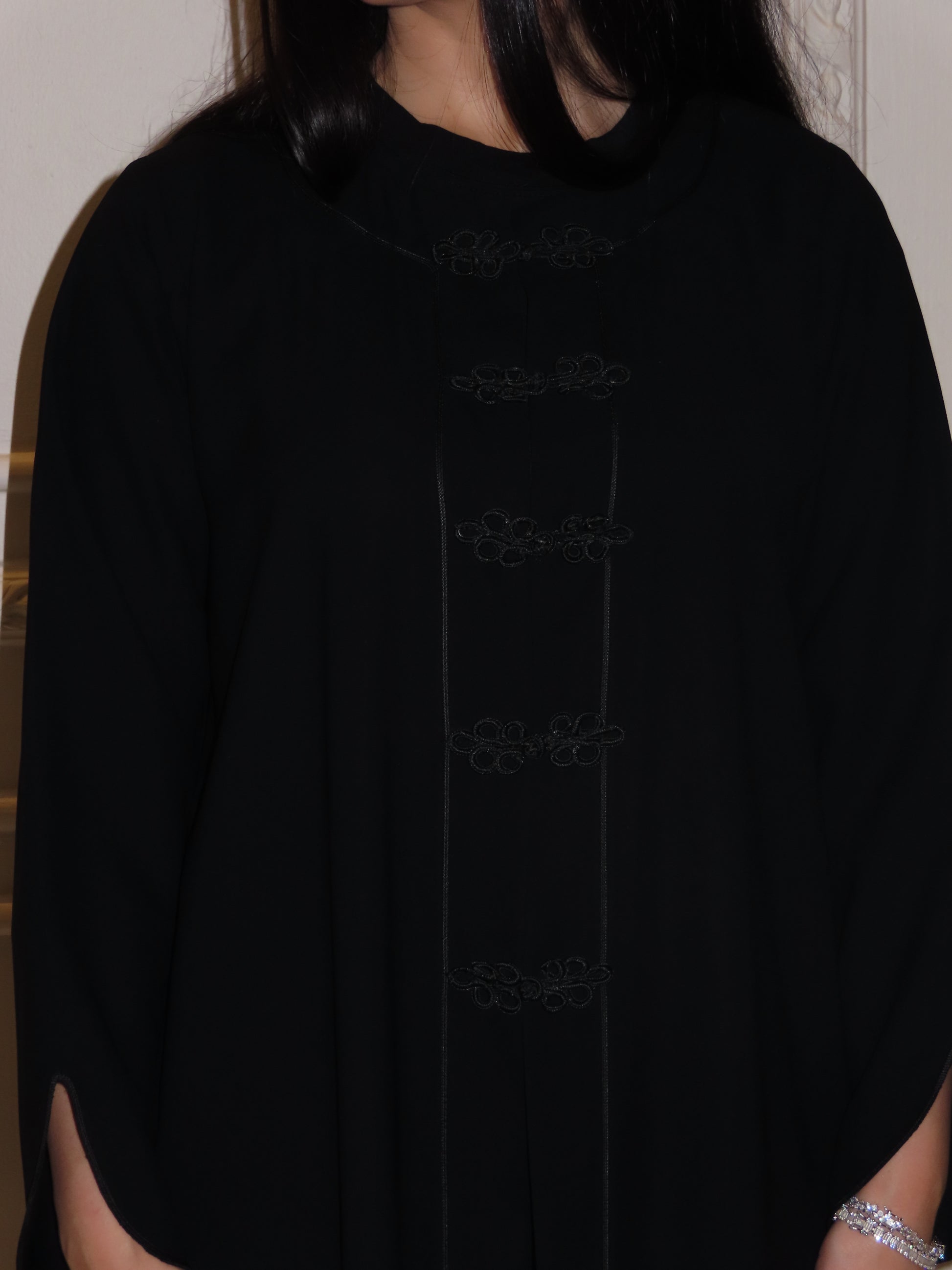A black abaya crafted from lightweight crepe fabric, featuring elegant Chinese knot buttons along the front with subtle line detailing.