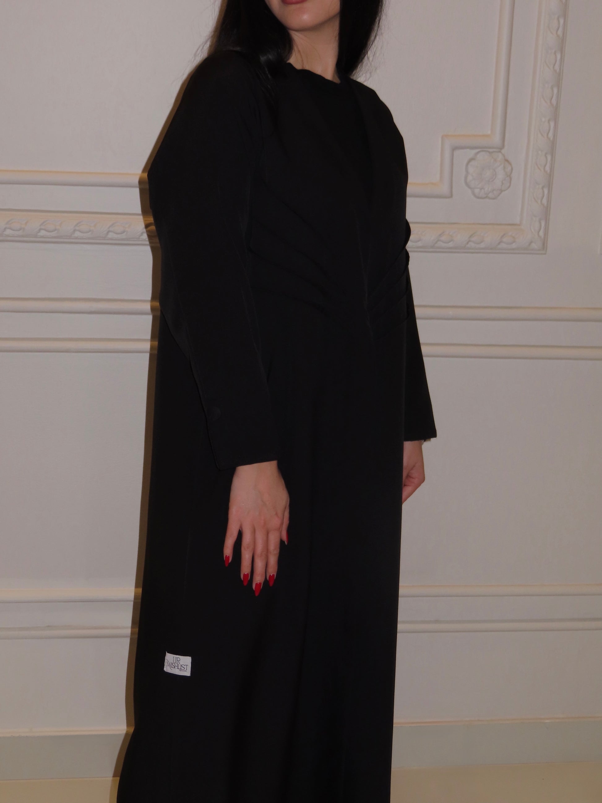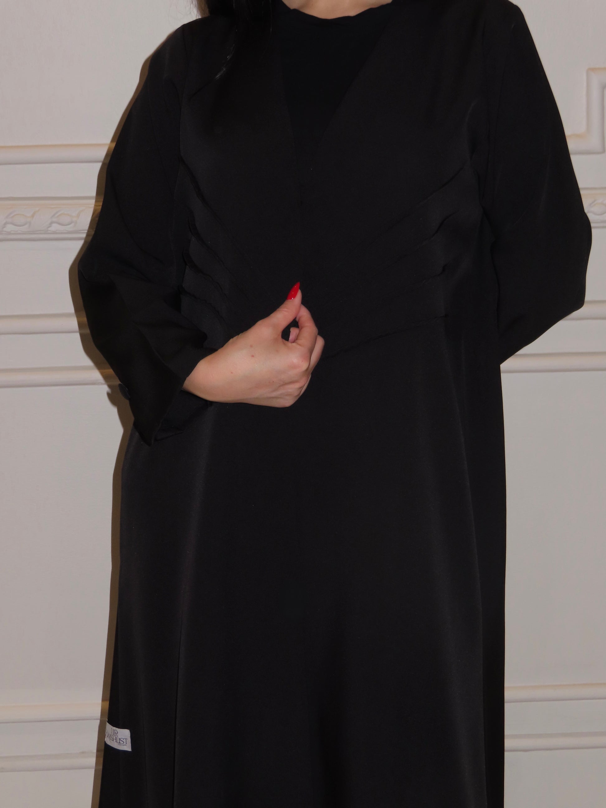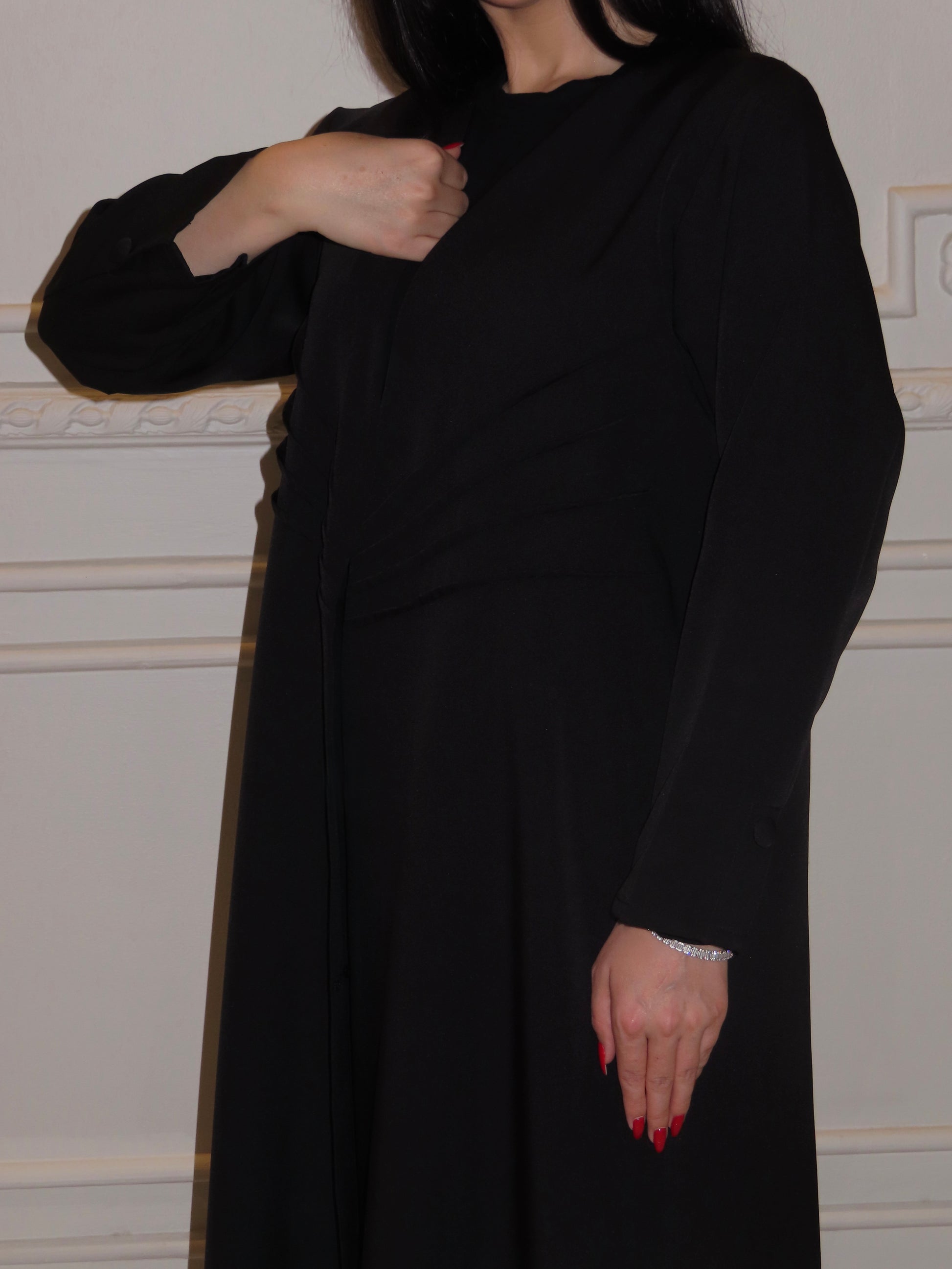 A black abaya using barbie featuring soft stitched tucks at the waist.