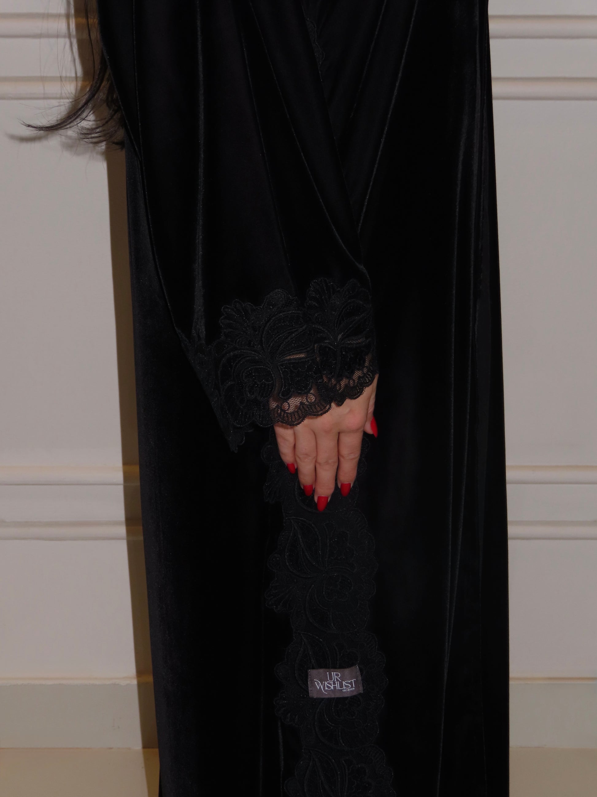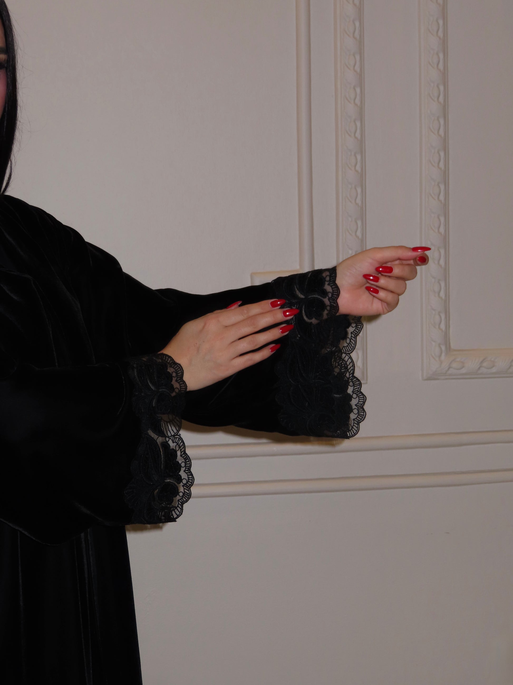 A abaya crafted from soft Korean velvet, featuring velvet lace detailing along both sides and the sleeves.